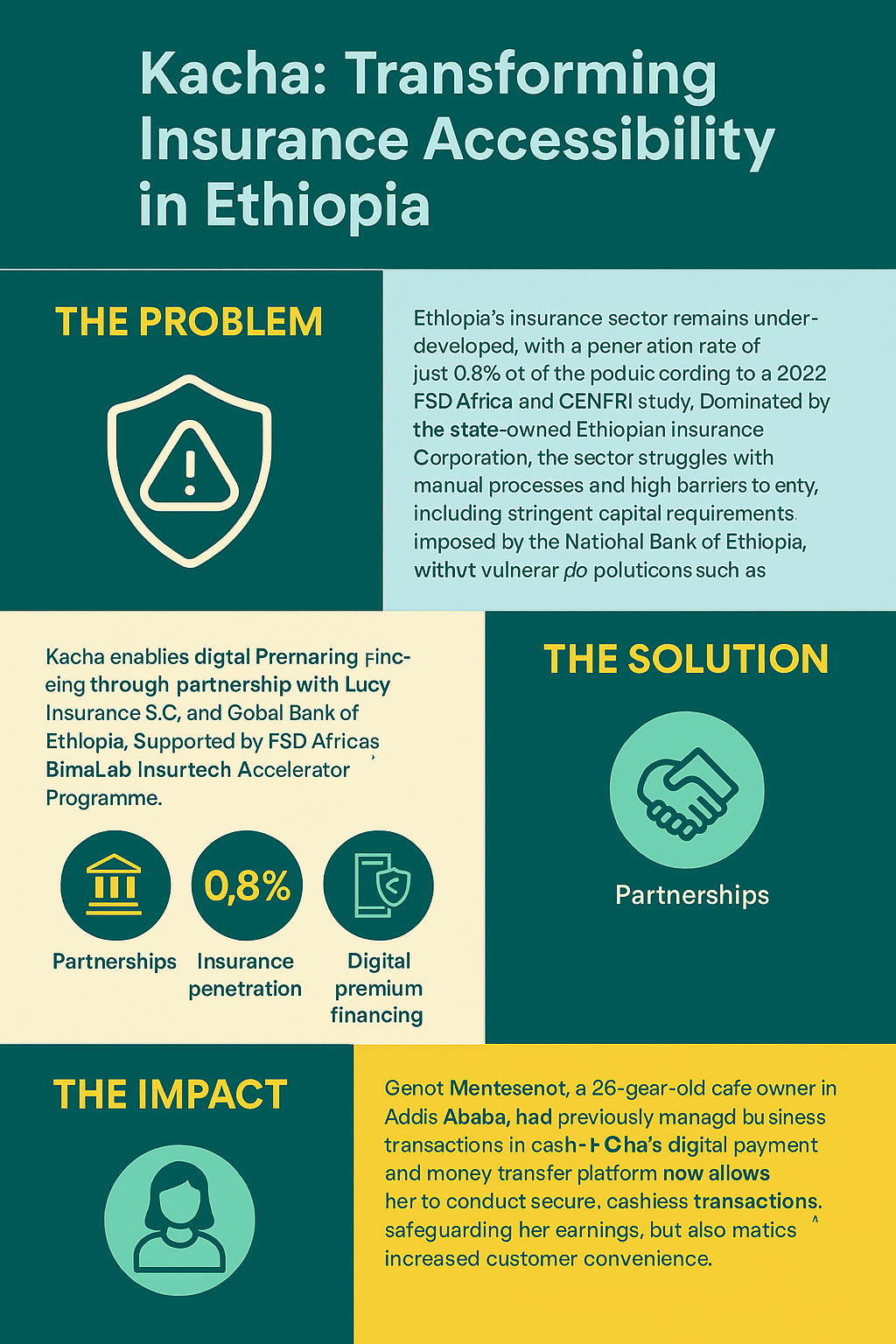 In response, Kacha Digital Financial Services (DFS), Ethiopia’s first private mobile money operator, is transforming insurance accessibility through digital innovation. Partnering with Lucy Insurance S.C. and Global Bank of Ethiopia, Kacha introduced digital premium financing to address the affordability gap. Supported by FSD Africa’s BimaLab Insurtech Accelerator Programme, Kacha designed customer-centric solutions to tackle product design and risk assessment challenges.